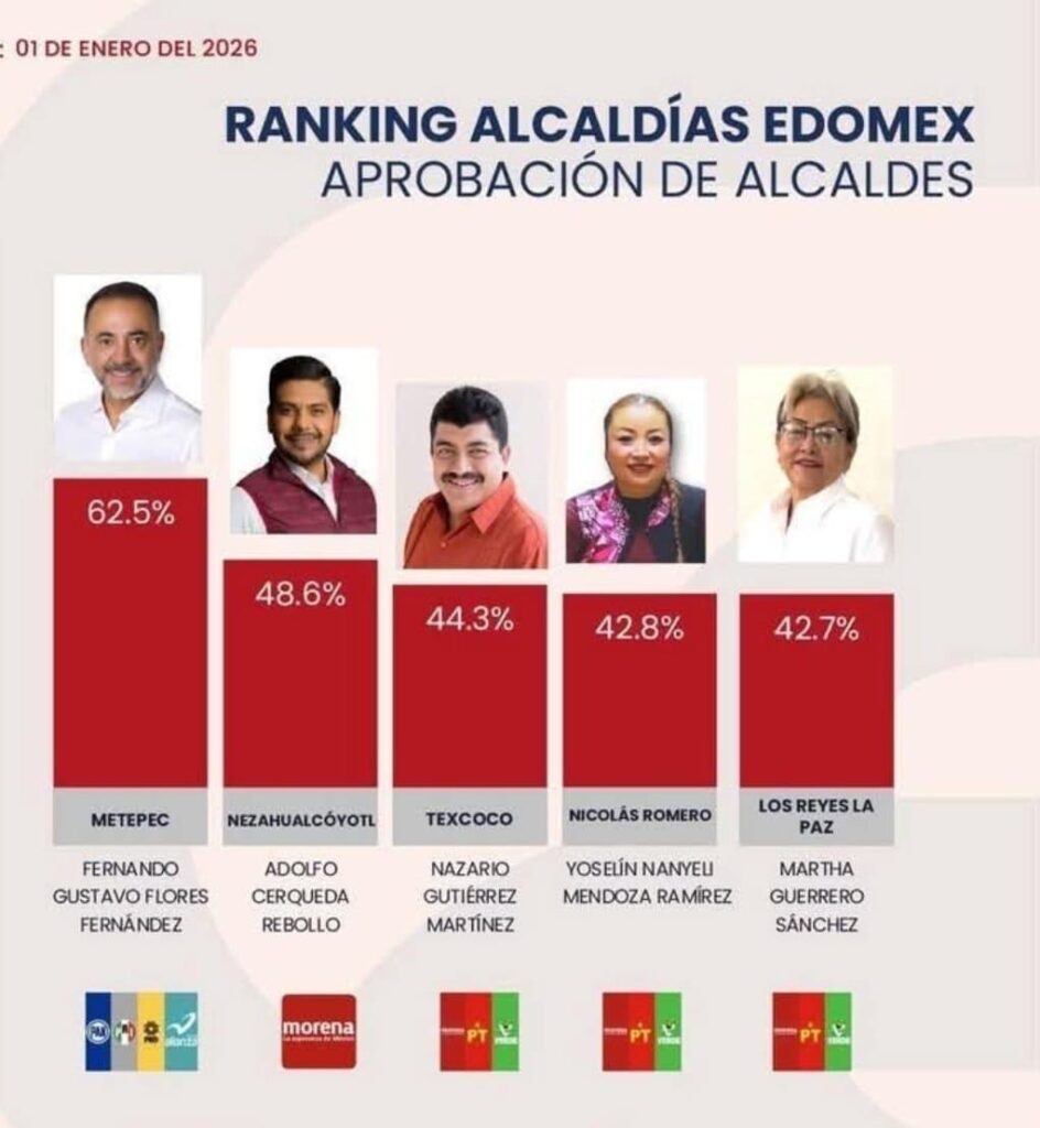El ranking de alcaldías mexiquenses revela que la edil alcanza un 42.8 por ciento de aprobación ciudadana, cifra que la coloca en el primer lugar entre los gobiernos municipales morenistas y consolida su liderazgo político al frente del municipio.