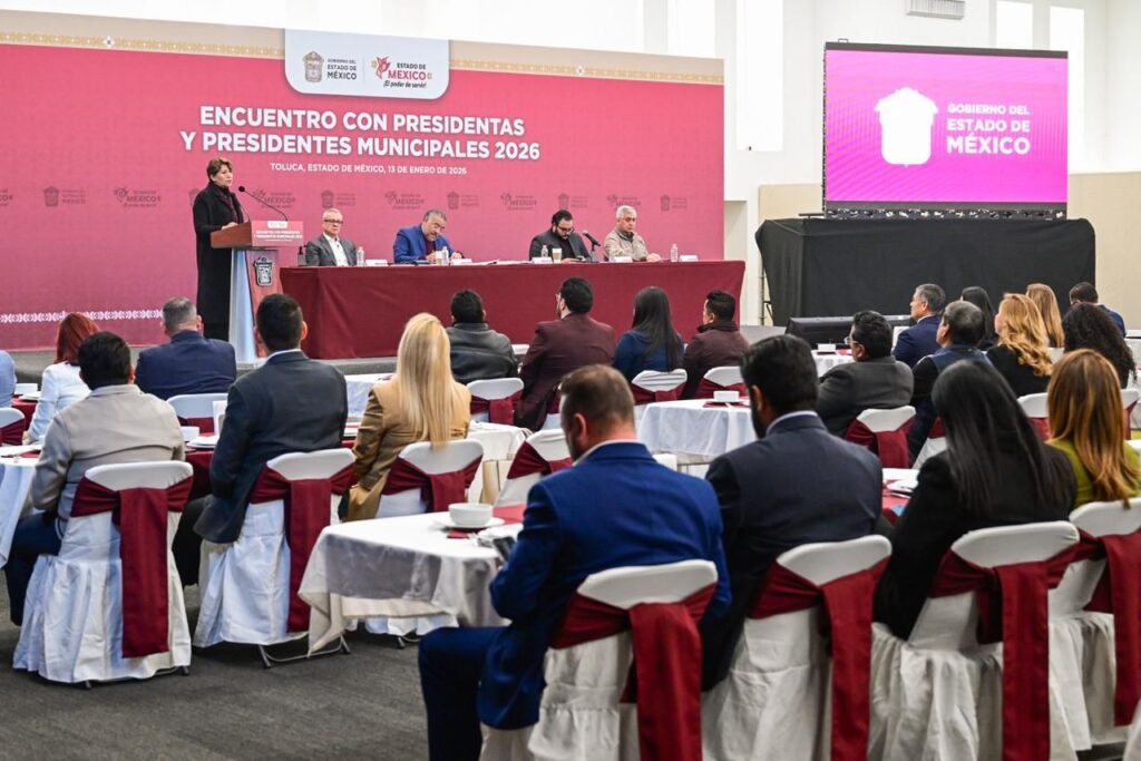 TOLUCA, MÉX.— Con un llamado a reforzar la coordinación entre los tres órdenes de gobierno, la gobernadora del Estado de México, Delfina Gómez Álvarez, sostuvo un encuentro de trabajo con las presidentas y presidentes municipales de la entidad, en el que estableció a la seguridad y la obra pública como los ejes rectores de la agenda estatal para 2026.