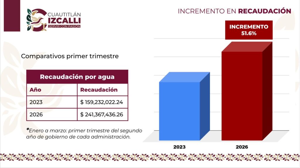 En paralelo, el organismo Operagua registró ingresos por 241 millones 367 mil 436 pesos, un alza del 51% en comparación con los 159 millones 232 mil 022 pesos obtenidos en 2023, además de superar en más del 28% lo recaudado en el mismo trimestre de 2025.